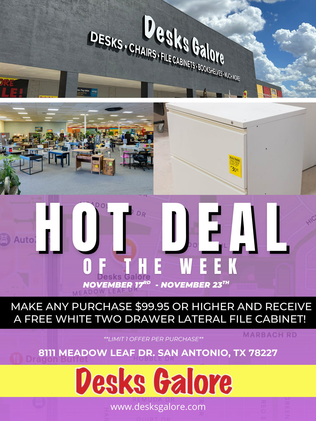 This week's HOT DEAL is a FREE White 2-Drawer lateral file cabinet when you have a purchase of $99.95 or higher!