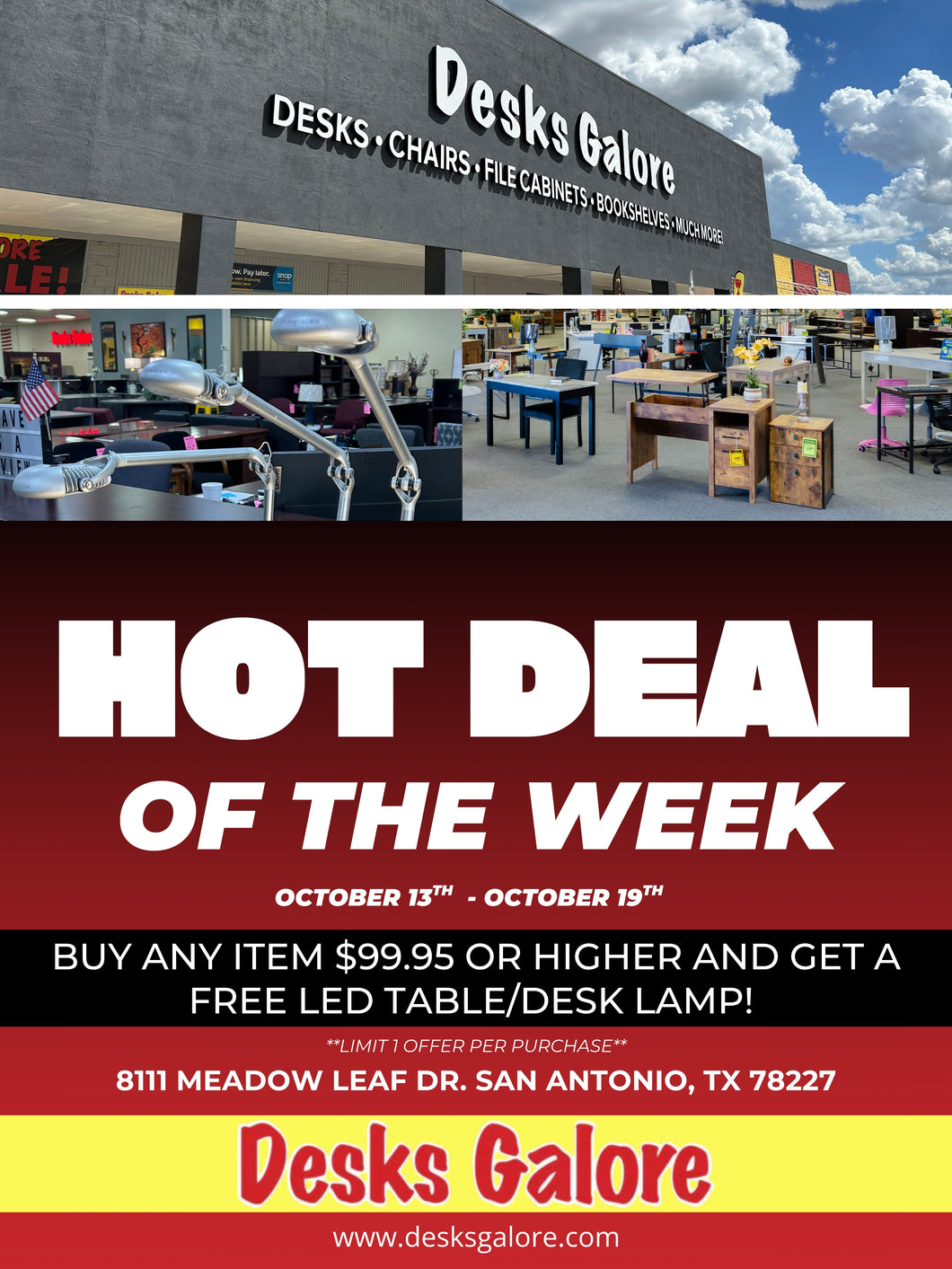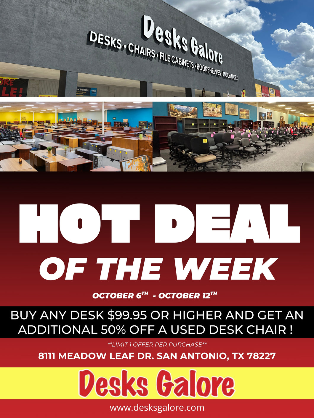 Happening this week at Desks Galore, we’re having a HOT DEAL! When you buy a DESK $99.95 or higher get an additional 50% off a USED desk chair!