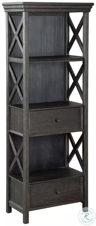 Invite your family into the heart of your home with the Tyler Creek dining room display cabinet. Black finish is beautifully textured. Put your dinnerware and decor on display on the top shelf. Store away essentials inside the roomy drawers. X-shape design down the sides makes it all around eye-catching. This is trend-right urban farmhouse style.