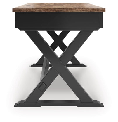 Raise the bar on modern farmhouse style with this home office desk. Its casual good looks are accentuated with a two-tone finish, which pairs a warm satin black base with a contrasting butcher block veneer desktop. The drop-down keyboard and cord management raceway bring both form and function to your at-home workspace. Use this desk as a stand-alone work area or combine it with the matching desk return (sold separately) to create a larger work surface.