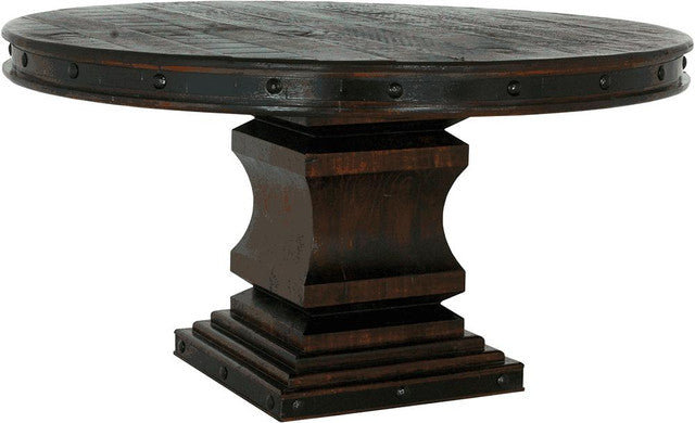 A beautifully crafted rustic pedestal round dining table from our Mexican dark stain collection. Features include made from 100% distressed pine wood to give it the old world look, and a lacquer seal to give it the modern feel. A decorative pedestal and a metal band with clavos or nail heads around the top side of the table and the bottom of the base, enhances its rustic old world charm.