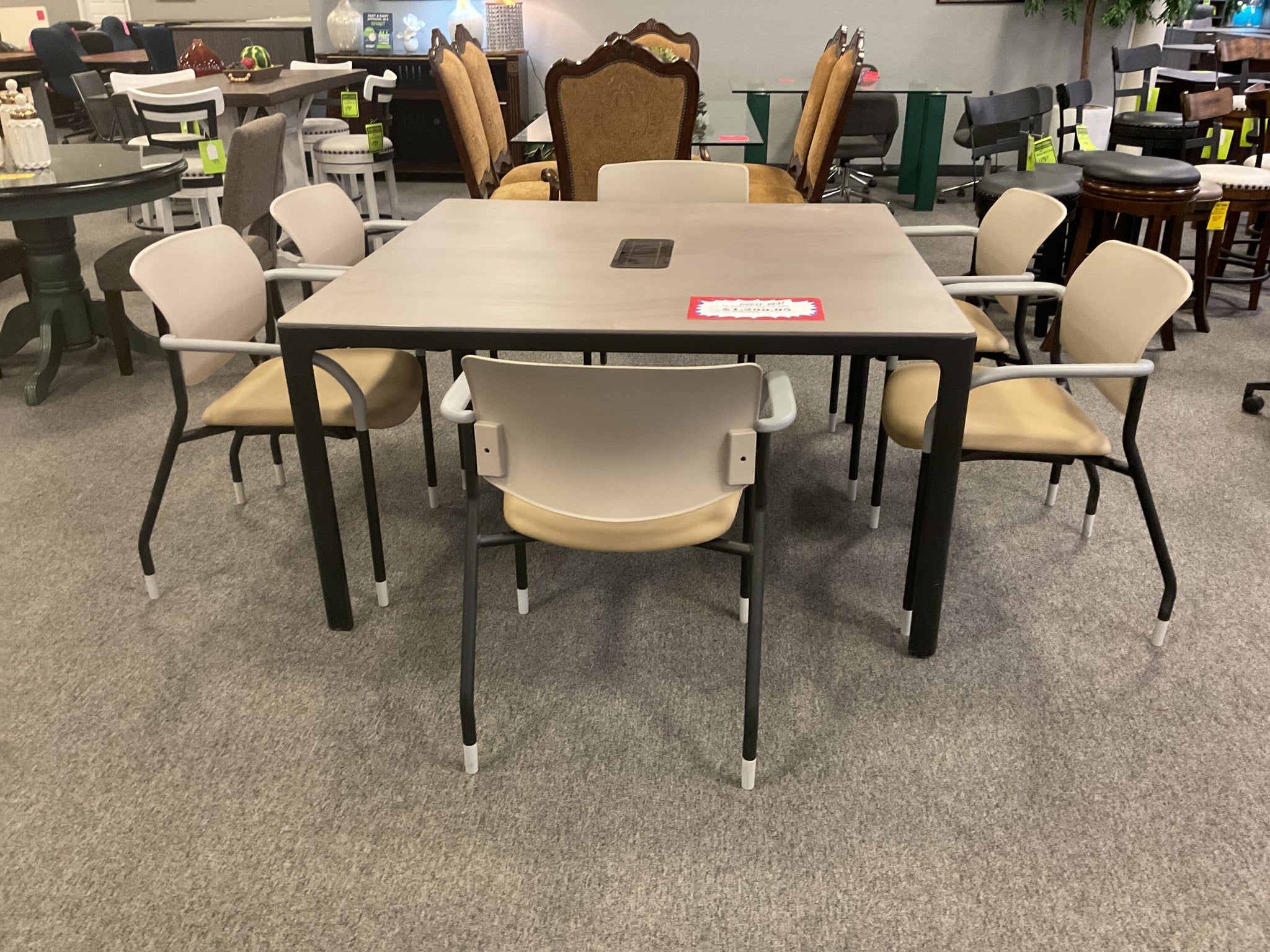 R467 55” Square Gray Wood/Metal Used Table w/6 Chairs $1,299.00 - 1 Only